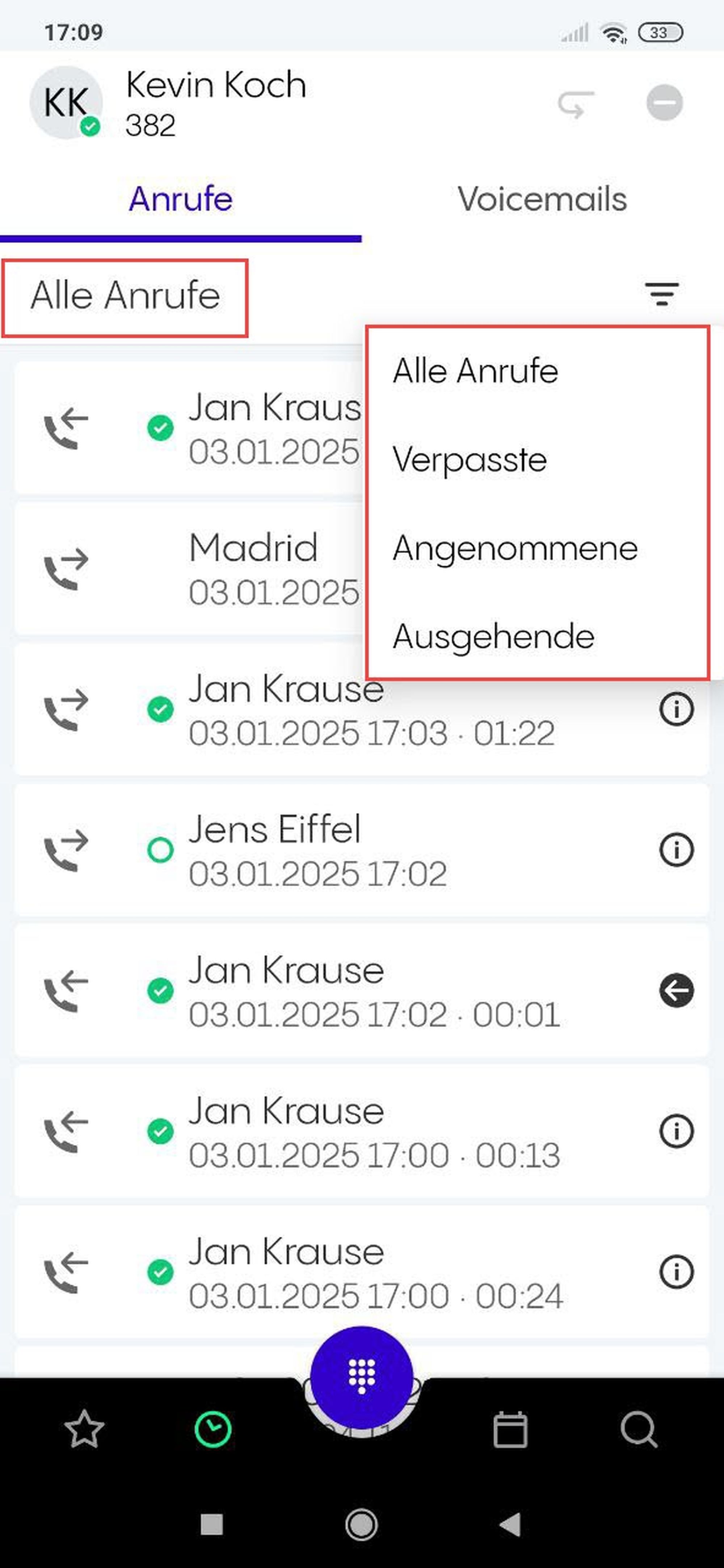 Die aktuelle Filteroption wird links oberhalb der Anrufliste angezeigt (im Beispiel Alle Anrufe).
