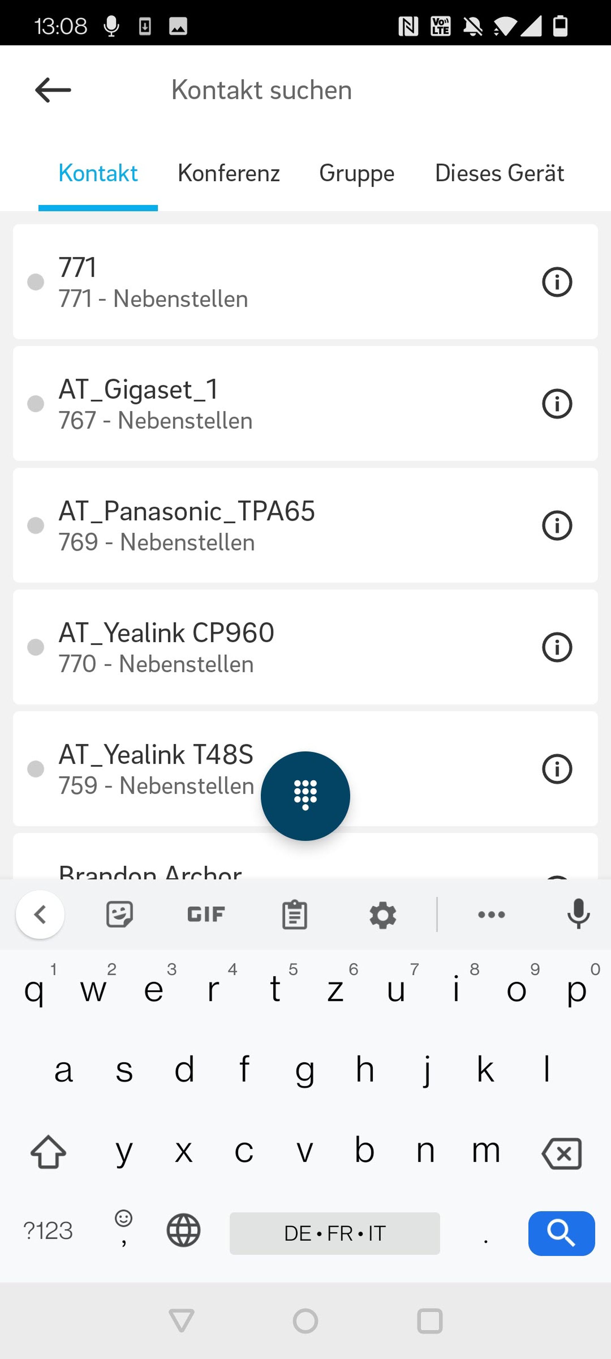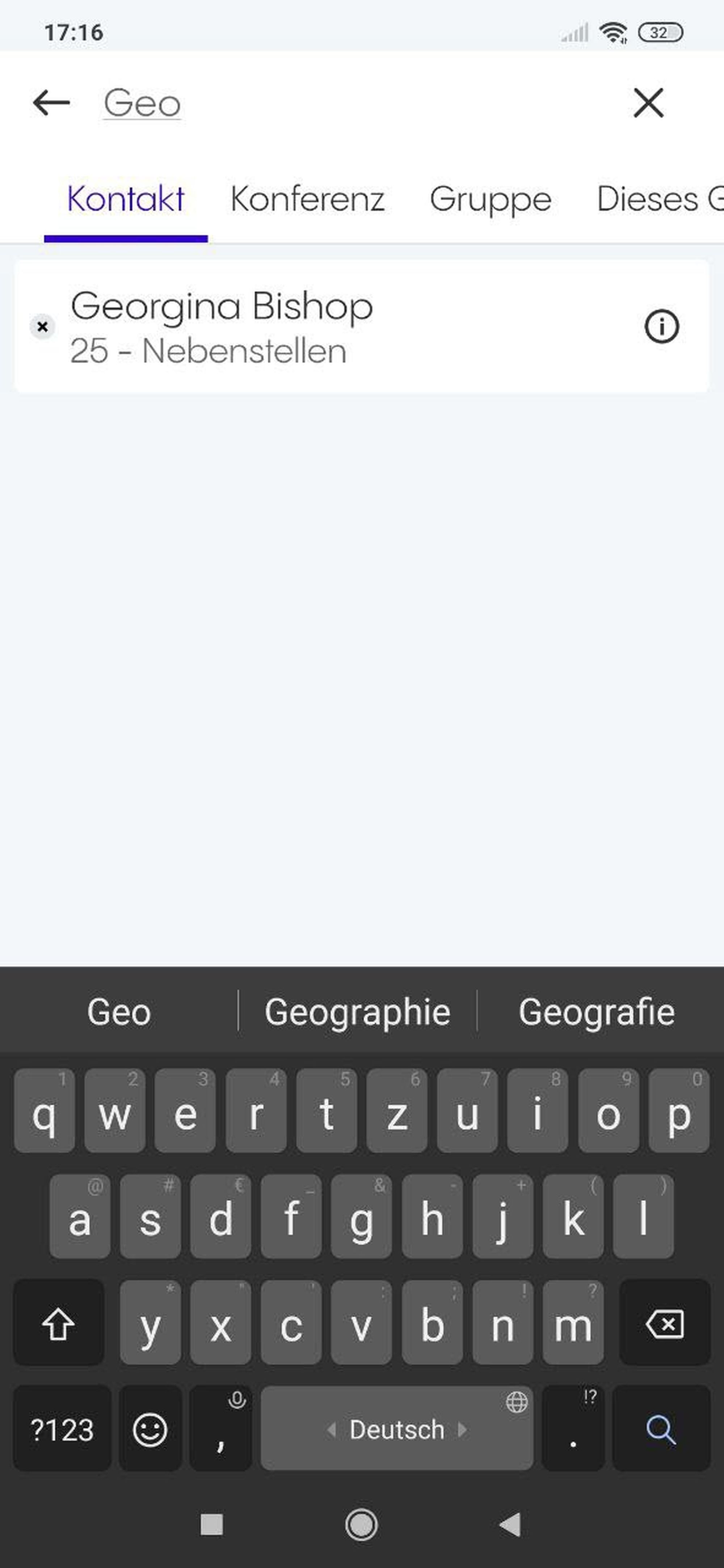 Nach Kontakten, Konferenzen und Gruppen aus Ihrer Telefonanlage suchen. Bitte beachten Sie, dass nur die Kontakte, Konferenzen und Gruppen Ihrer Telefonanlage bei einer Standardsuche berücksichtigt werden.