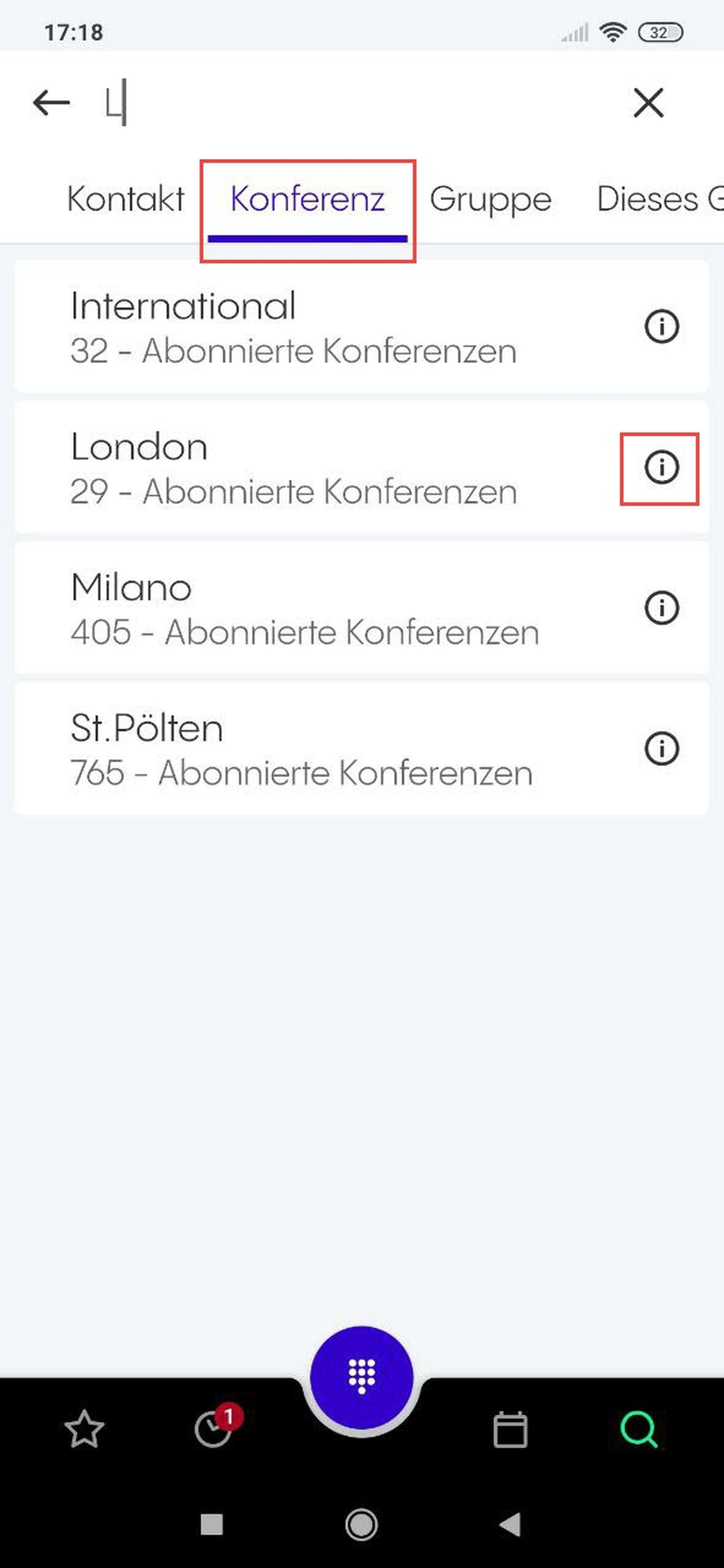 Bei einer abonnierten Konferenz können Sie auf das Info-Symbol tippen, um detaillierte Informationen zu dieser Konferenz aufzurufem, einschließlich der PIN, die für die Teilnahme an der Konferenz erforderlich ist.