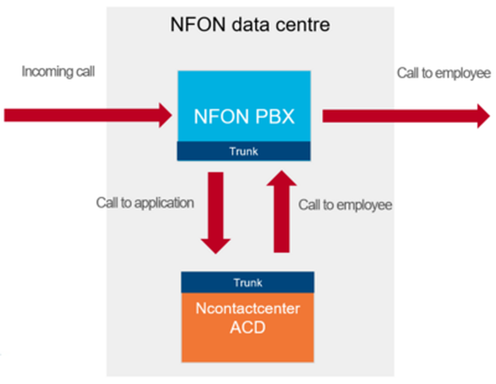 The Ncontactcenter solution connects to the NFON PBX via a SIP trunk. Consequently, the call goes over from the PBX to the Ncontactcenter solution.