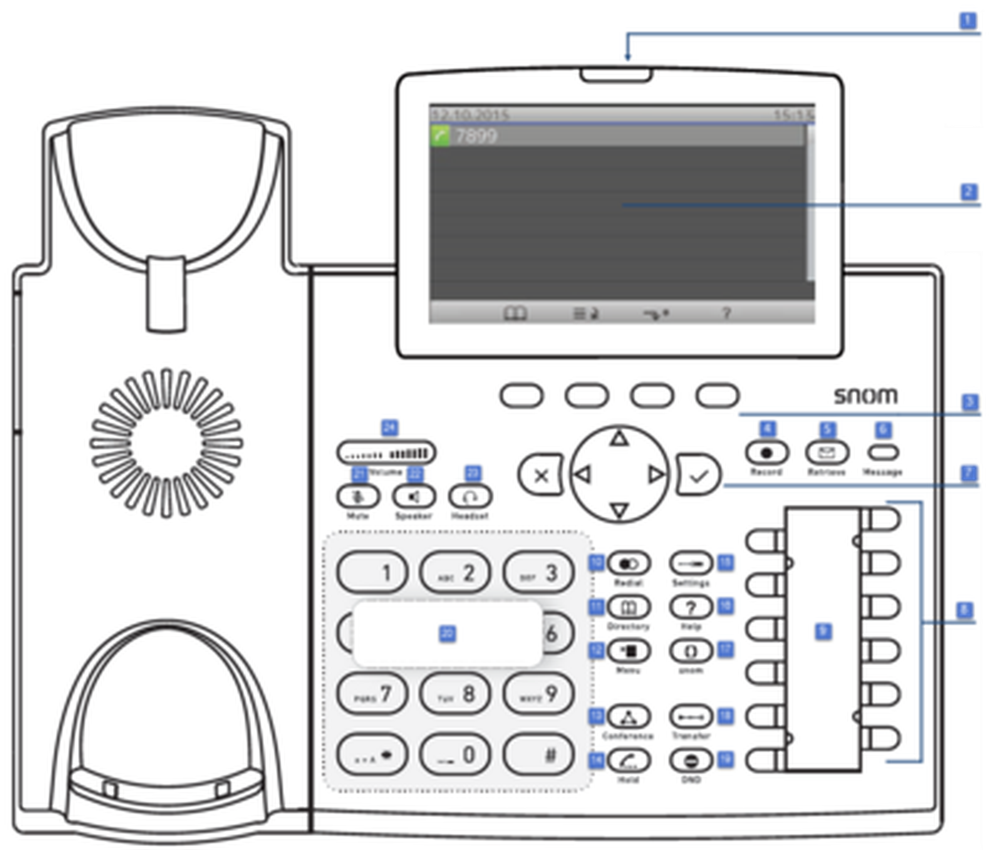 | 25 | Navigation key: Confirming, saving actions & input, and returning to previous screen / Accepting calls on speakerphone and in headset mode / From idle screen: Dialed calls (redial) |