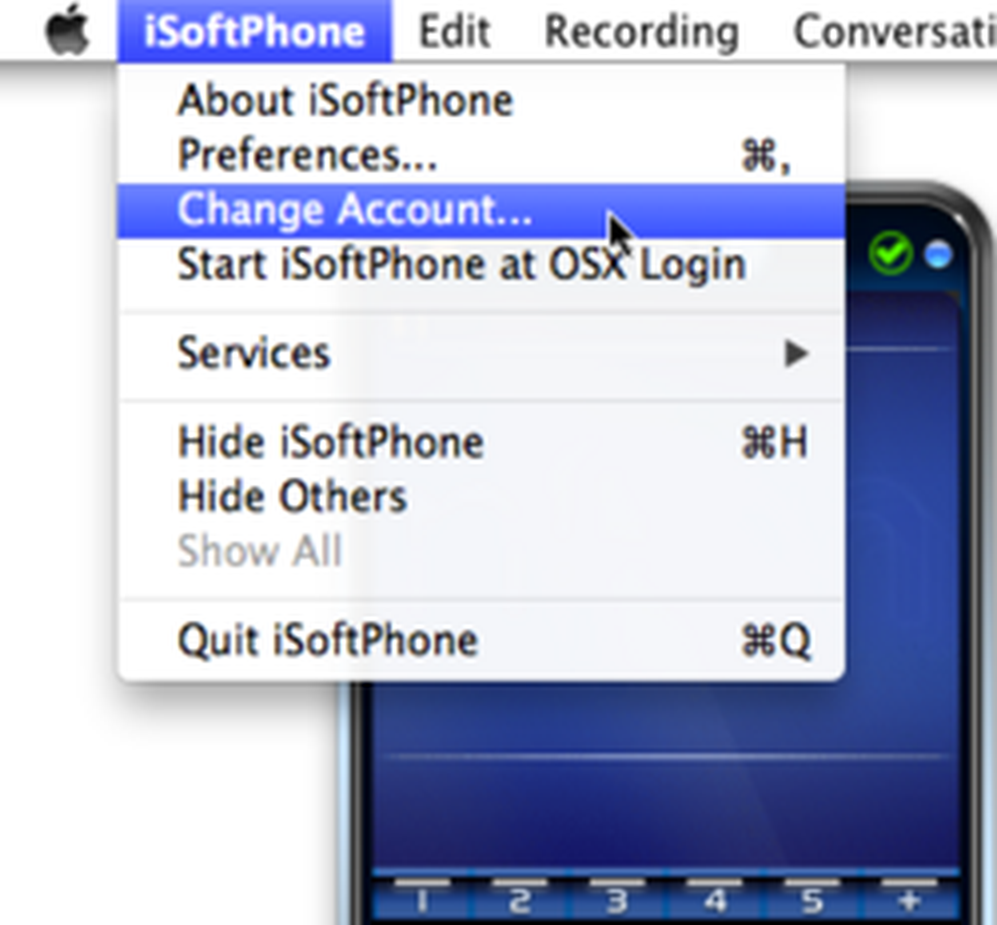 1. To do so, please start the iSoftPhone and in the iSoftPhone menu item, select “Change Account...”