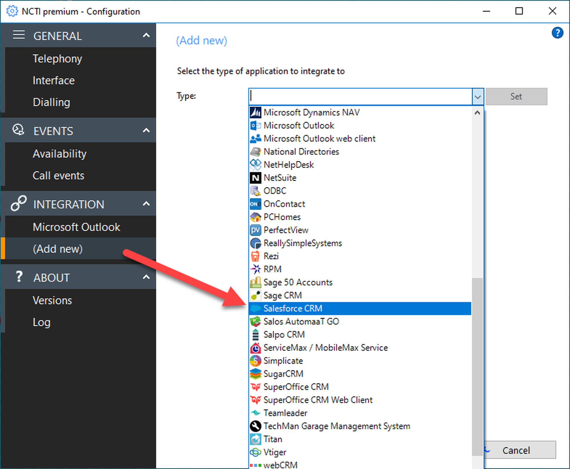 Activate Salesforce by clicking on (Add new) in the Integration section. Select Salesforce CRM in the Type dropdown.