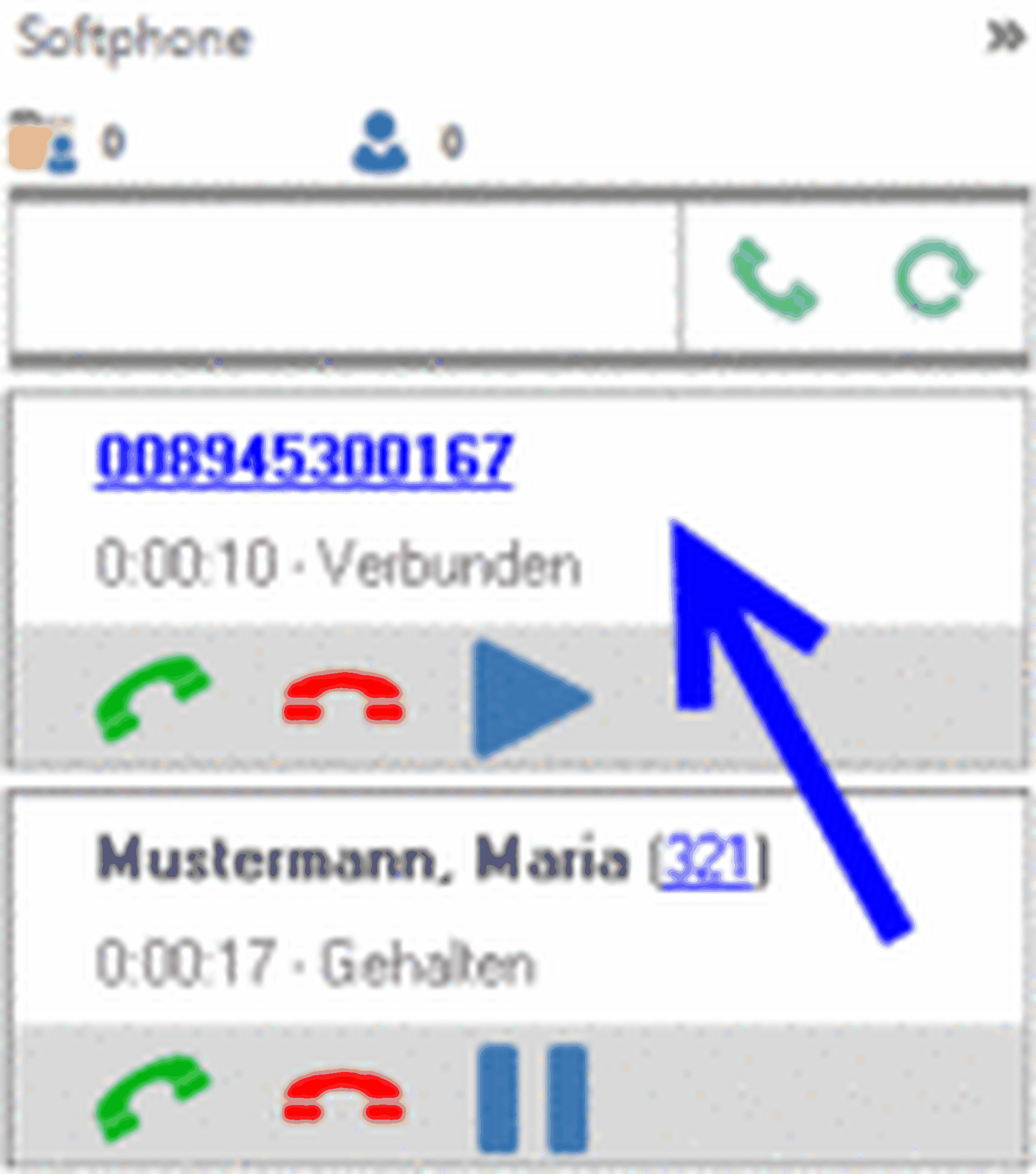 | Active conversation; by clicking this symbol, caller is placed on hold | |